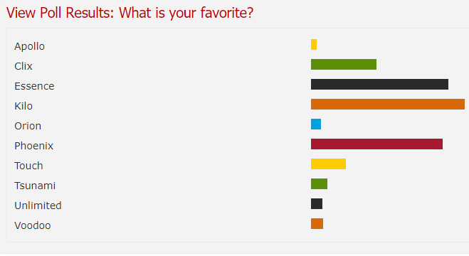 I rightfully mentioned the Phoenix, because it’s my favorite. Kilo and the classic Essence are also quite popular. Take a look at this poll from the Bodybuilding.com forums with 1500+ votes:
